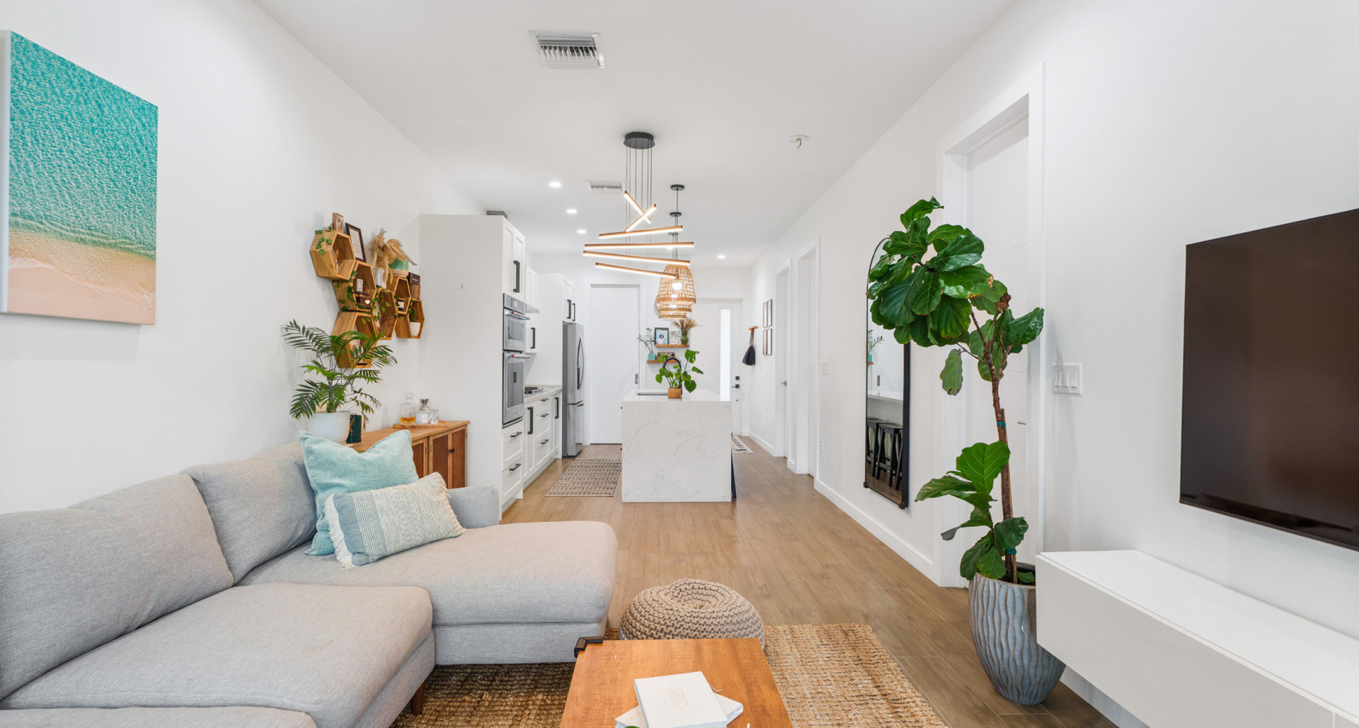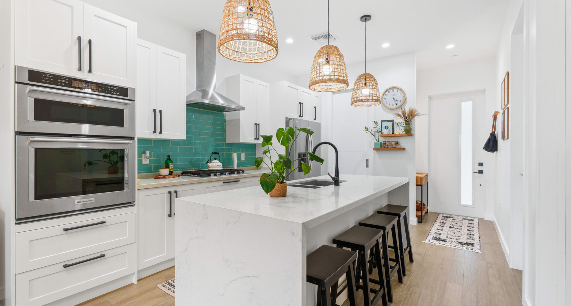 An extended kitchen with an island, not standard in the 2-bed options, adding workspace, storage, and natural flow