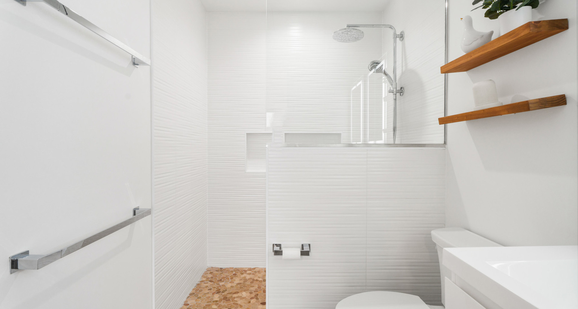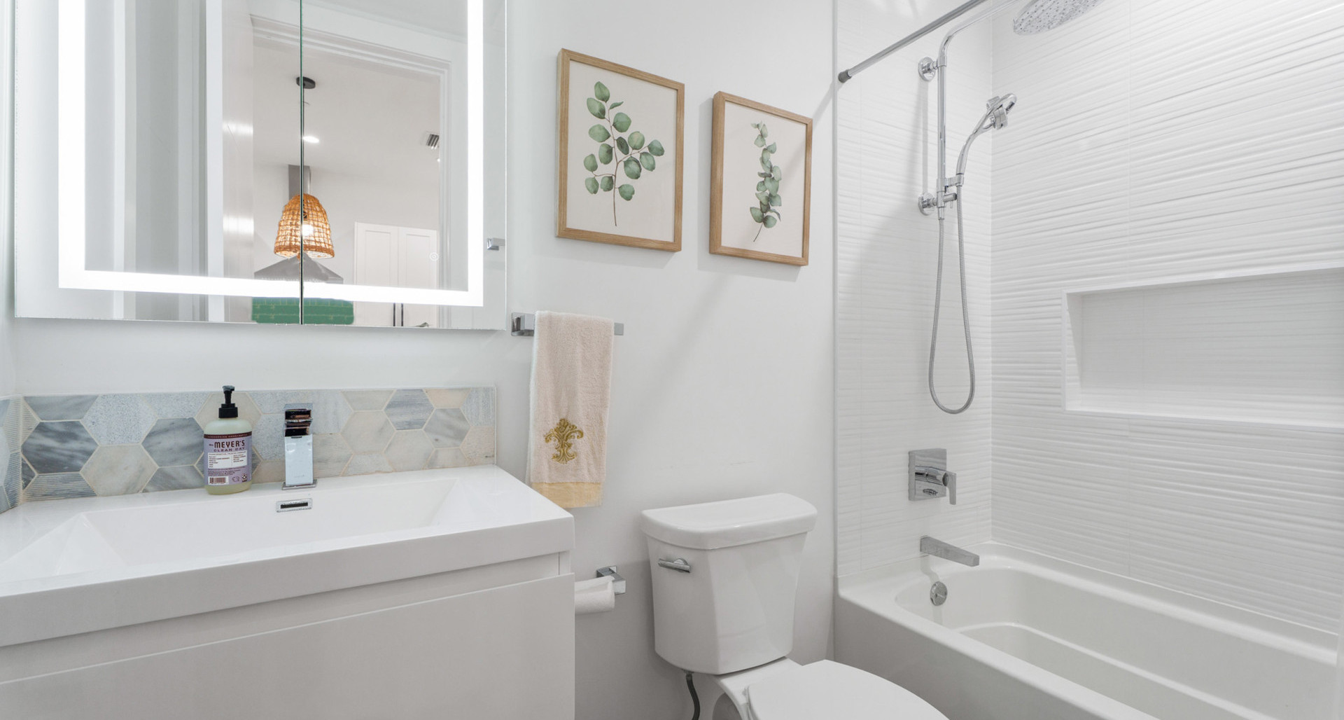 A reimagined extended guest bathroom featuring a square bath/shower combination instead of the smaller, standard triangular enclosure found in other units