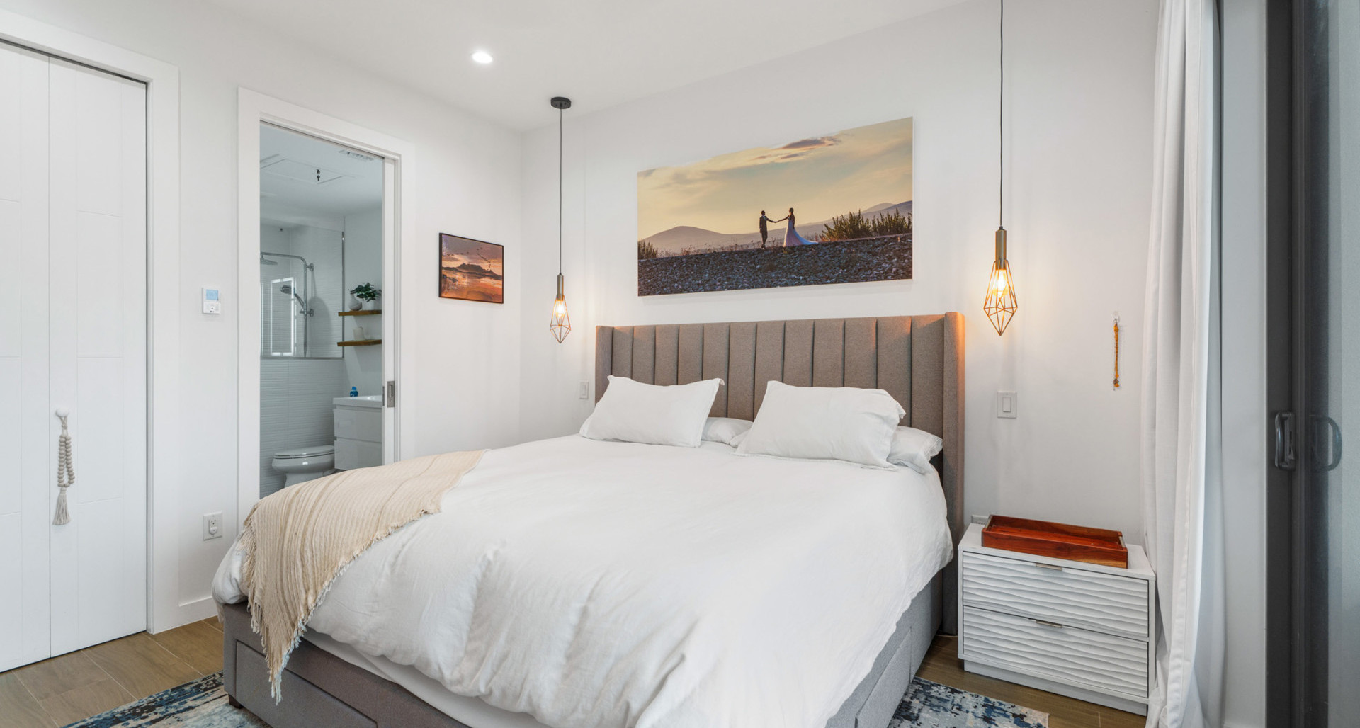 Custom bedroom storage in the second bedroom, with built‑ins framing the bed