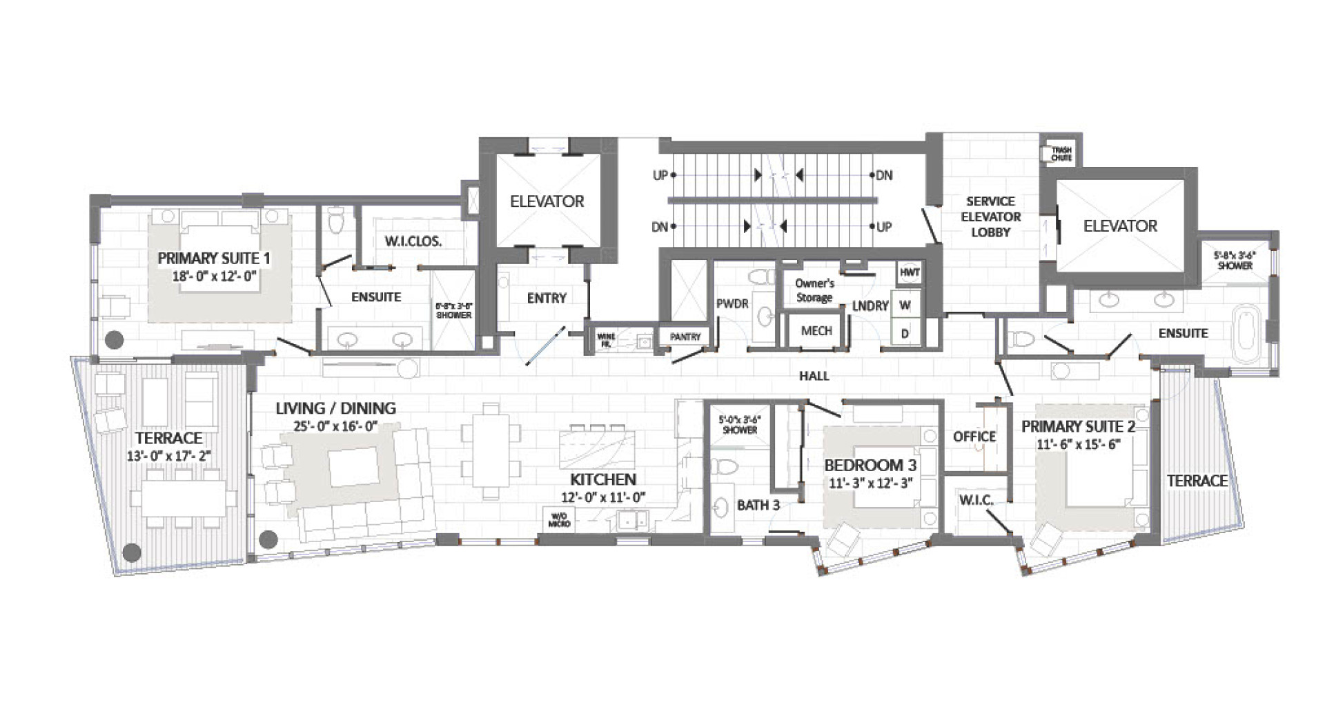 Aqua Bay will offer a daily rental program which owners can utilize while not in residence, making this building the newest and most luxurious daily rental destination in Grand Cayman. With 2,646 sq. ft. and featuring 3 bedrooms and 3.5 bathrooms, this villa features an open concept living/dining area and kitchen with wet bar, 2 Primary Bedrooms Suites each with luxurious spa bathrooms – one with access to a large terrace with stunning views of Seven Mile Beach and the other facing North Sound with a terrace to enjoy incredible sunrises and views to Rum Point and Cayman Kai, a powder room, a home office and laundry room. Additionally, by virtue of the central core design, you will enjoy a private elevator entryway to your villa.