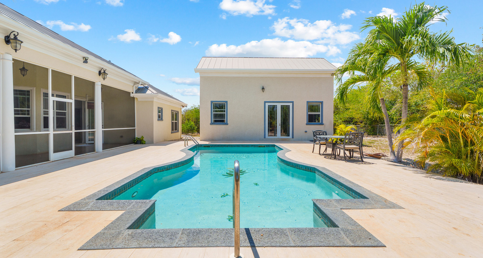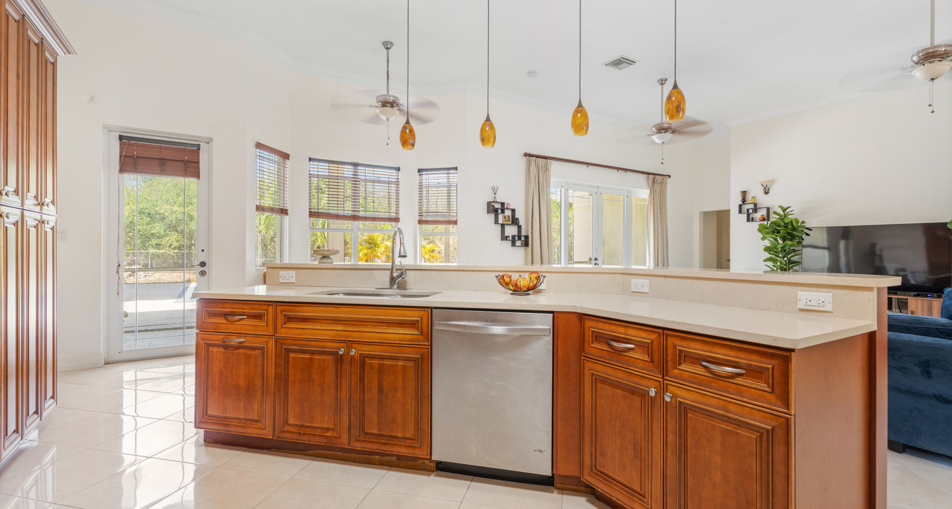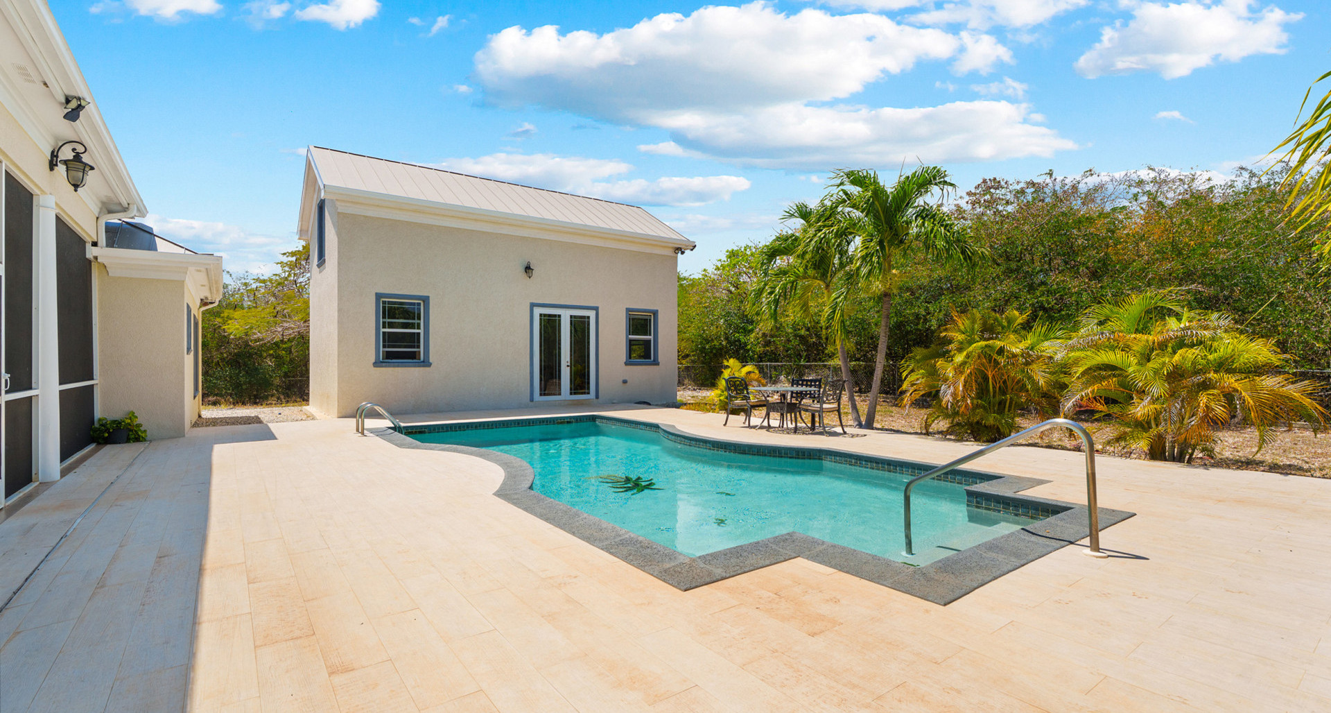 Designed for comfortable island living, the main home features generous living areas with soaring 12-foot ceilings, creating an airy, light-filled atmosphere throughout. The well-appointed kitchen with solid wood cabinetry flows seamlessly into the dining and living spaces, making it perfect for both everyday living and entertaining.