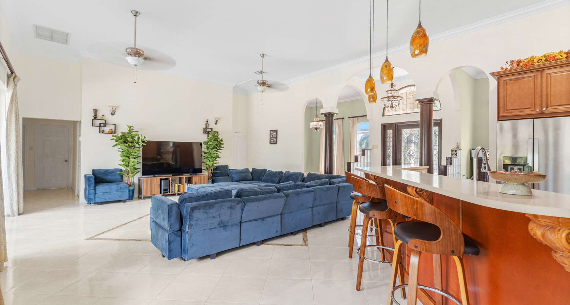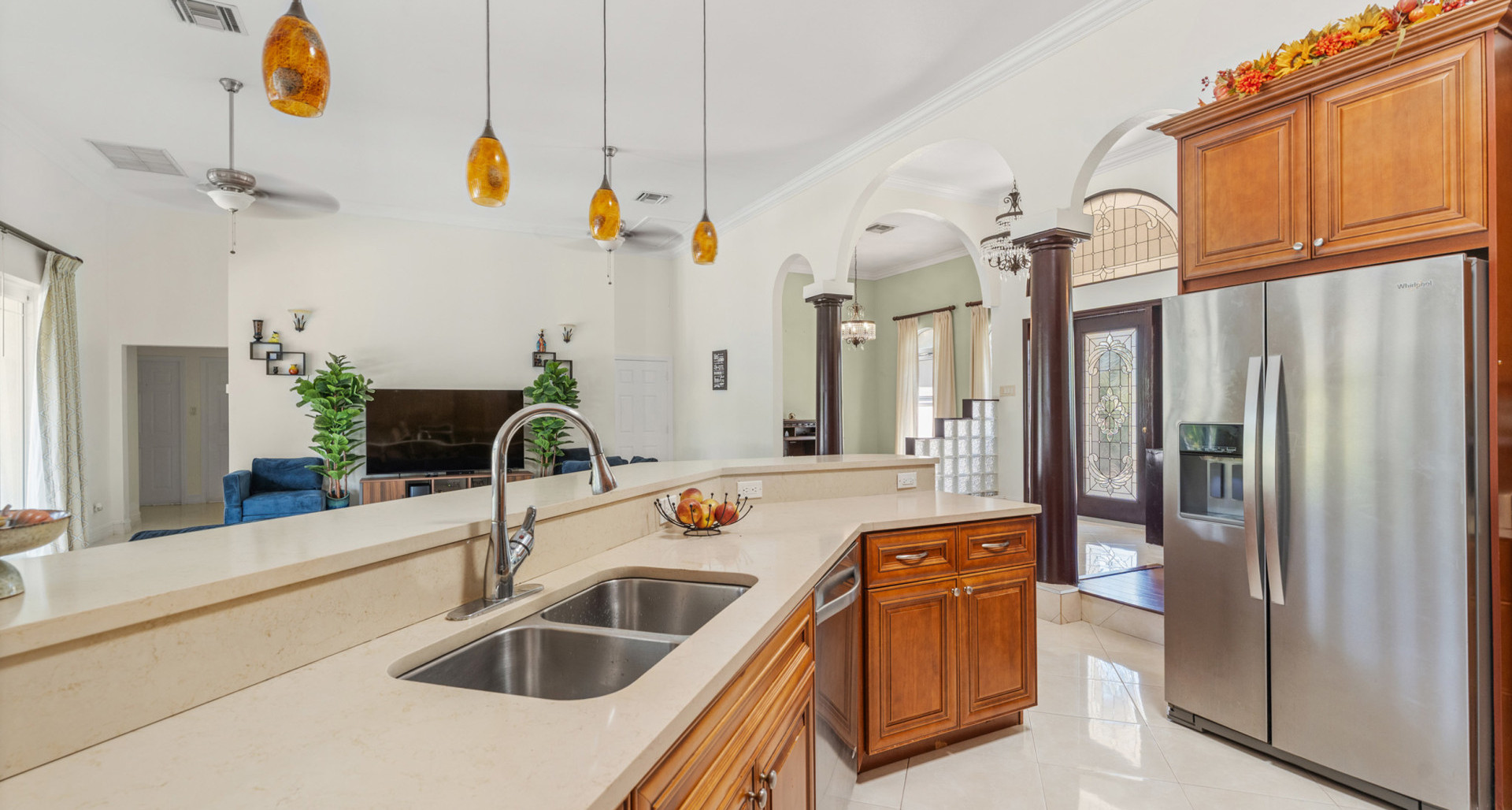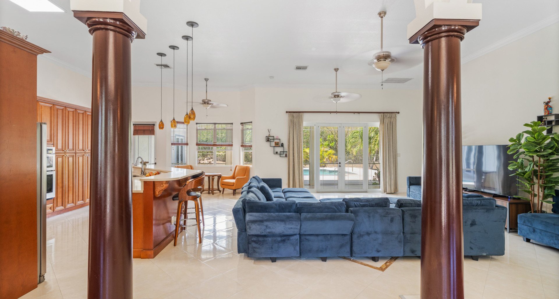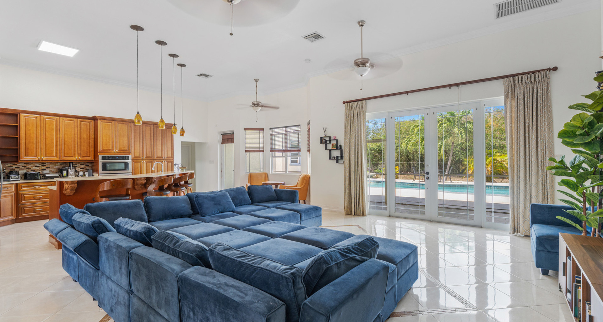 Designed for comfortable island living, the main home features generous living areas with soaring 12-foot ceilings, creating an airy, light-filled atmosphere throughout. The well-appointed kitchen with solid wood cabinetry flows seamlessly into the dining and living spaces, making it perfect for both everyday living and entertaining.