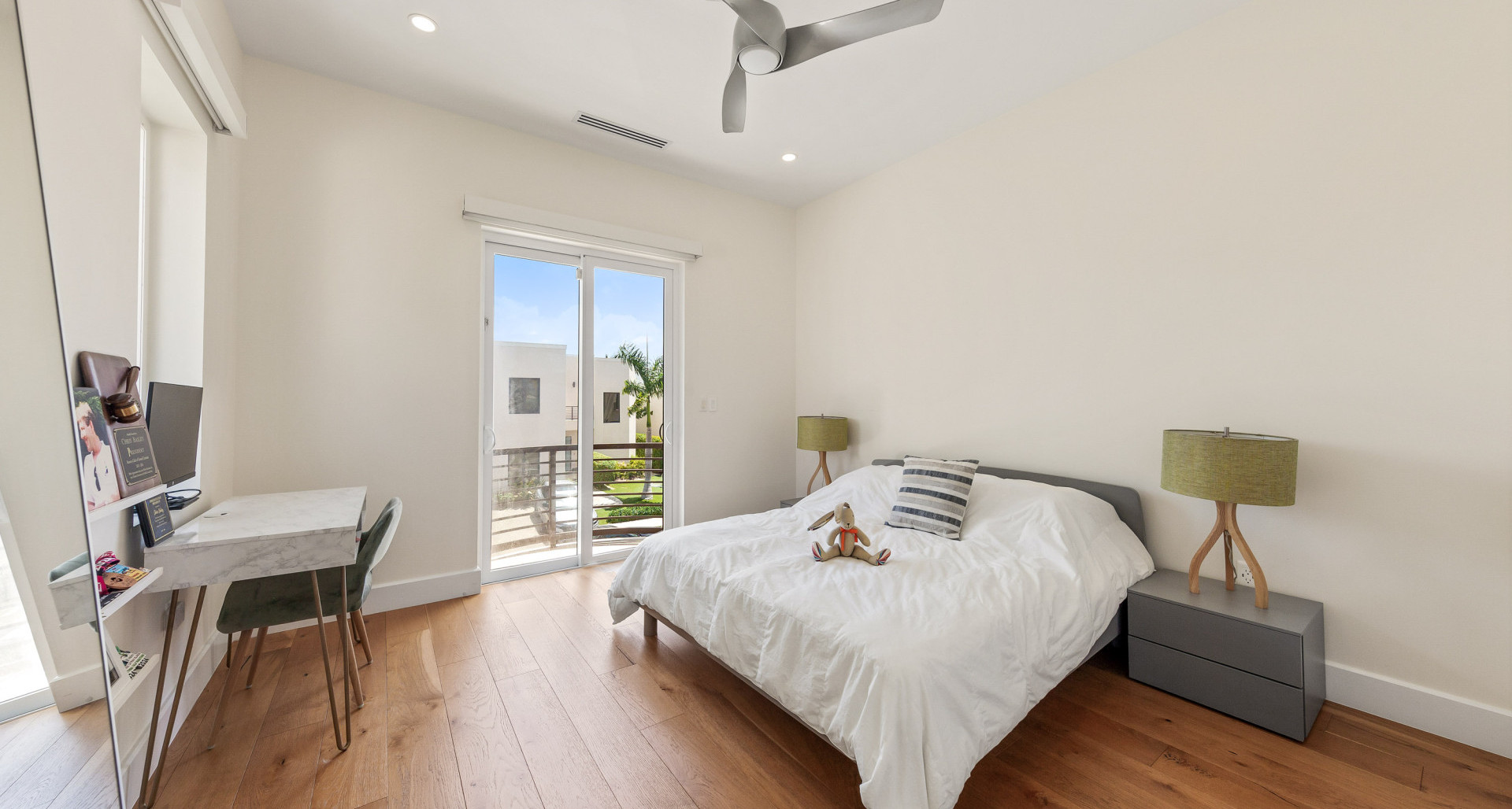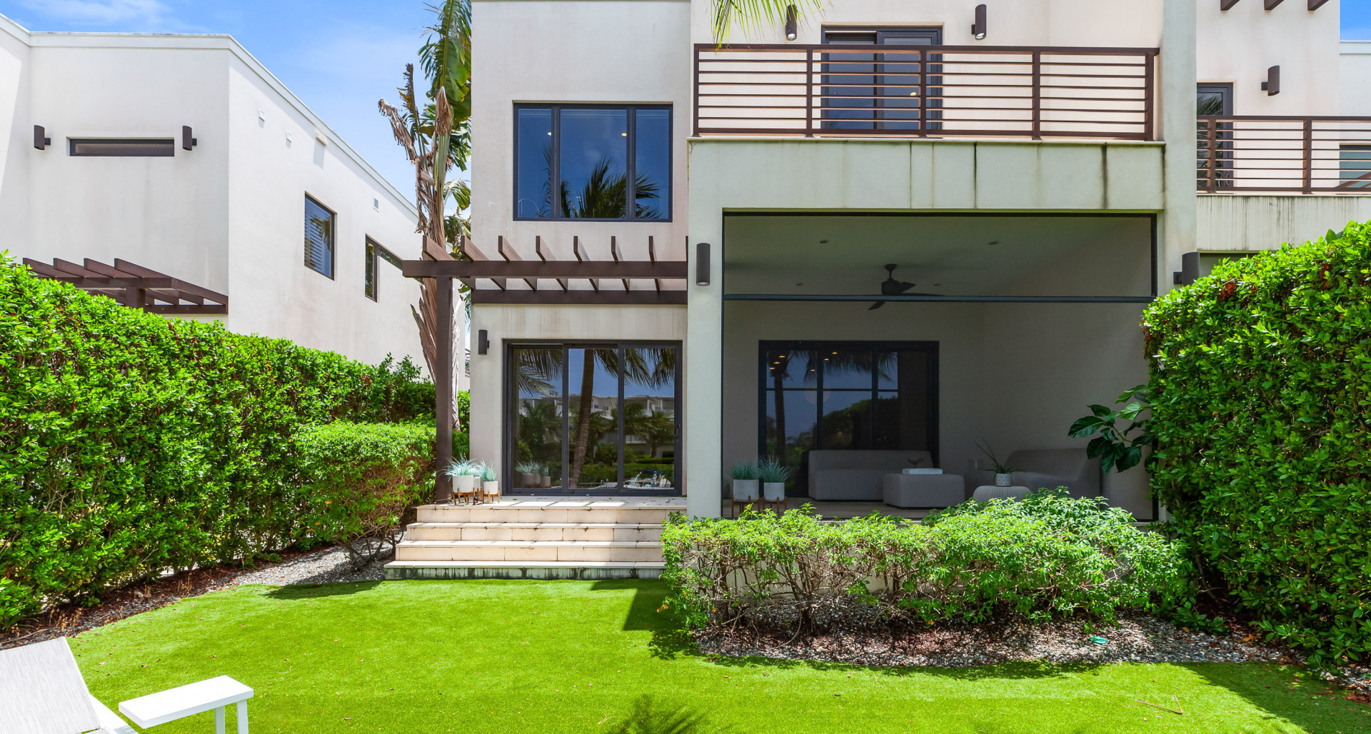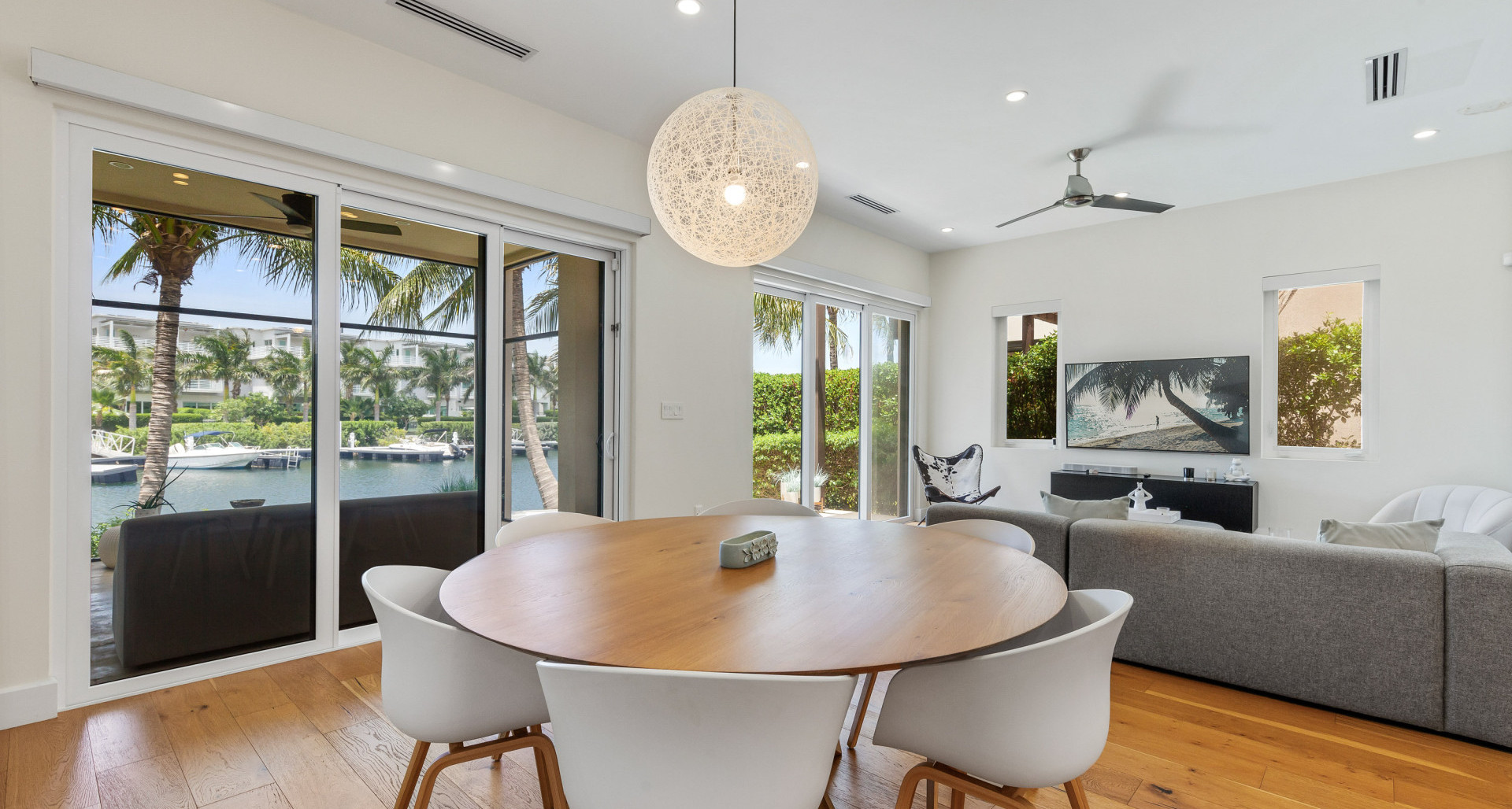 Entering the property you first notice the engineered hardwood floors (which continue throughout the home) which lead you into the large open plan living / dining / kitchen, flanked by the den, and spacious screened rear patio that adjoins the synthetic turfed garden and the canal beyond. The custom kitchen, with its crisp clean lines, is made by KW kitchens, one of the island's premier cabinet makers, and is topped with exquisite White Macabus Quartzite counter tops and is finished with Bosch appliance package. The second floor includes the airy master bedroom suite with walkout balcony overlooking the wide canal, ample walk-in closet and 5 piece bathroom which includes voluminous shower and Victoria and Albert bathtub. The two other double bedrooms, one with walk-in closet the other with custom fitted closet and ensuite bathrooms, and laundry room complete the accommodation on the upper floor.